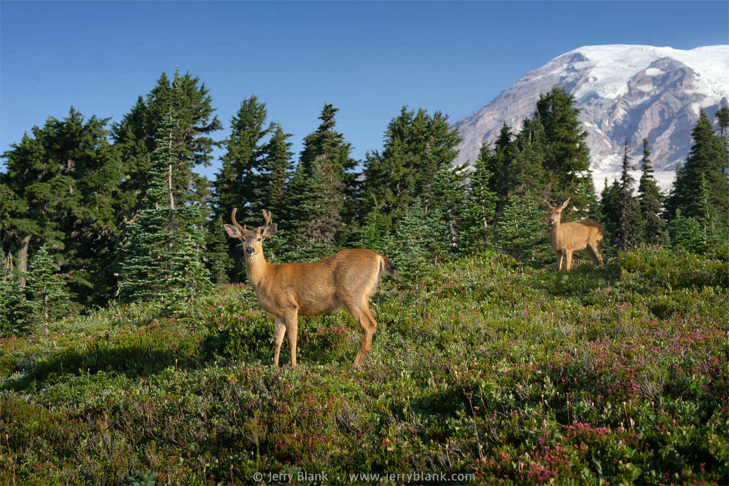 #70201 - A pair of black-tailed mule deer graze on the southeast foothills of Mount Rainier in Washington